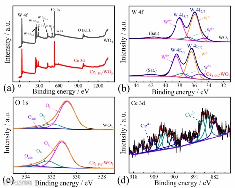 图3 WO3和Ce1.5%-WO3的XPS光谱(a)、高分辨率W4f (b)、O1s (c)和Ce3d (d)