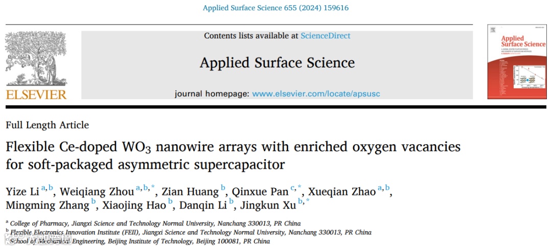 近日,来自江西科技师范大学的周卫强教授与北京理工大学的潘勤学教授合作,在国际期刊Applied Surface Science上发表题为“Flexible Ce-doped WO3nanowire arrays with enriched oxygen vacancies for soft-packaged asymmetric supercapacitor”的观点文章。该观点文章合理构建了Ce掺杂WO3纳米线阵列电极,探索其结构与性能之间的关系,对高性能超级电容器的发展起到极其重要的作用。