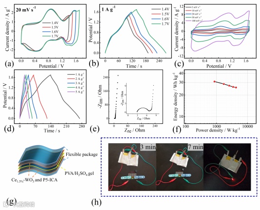 图5 基于Ce1.5%-WO3//P5-ICA的PVA/H2SO4凝胶电解质柔性全固态ASC的电化学性能:(a) 20 mV s-1下不同电压窗下的CV曲线,(b) 1 A g-1下不同电压窗下的GCD曲线,(c)不同扫描速率下的CV曲线,(d)不同电流密度下的GCD曲线,(e) Nyquist图,(f) Ragone图,(g)柔性ASC原理图,(h)照明定时和LED数字照片