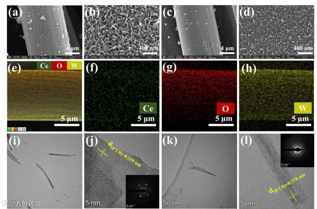 图1 WO3(a, b)和Ce1.5%-WO3(c, d)的SEM图像;Ce1.5%-WO3的能谱图(e-h);WO3(i, j)和Ce1.5%-WO3(k, l)的TEM和HR-TEM图像;WO3(j: 插图)和Ce1.5%-WO3(l: 插图)的SAED