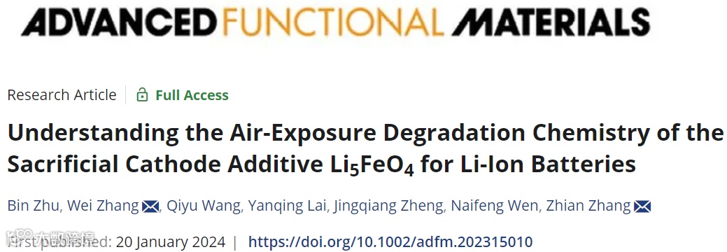 B. Zhu, W. Zhang, Q. Wang, Y. Lai, J. Zheng, N. Wen, Z. Zhang, Understanding the Air-Exposure Degradation Chemistry of the Sacrificial Cathode Additive Li5FeO4 for Li-Ion Batteries. Adv. Funct. Mater. 2024, 2315010.