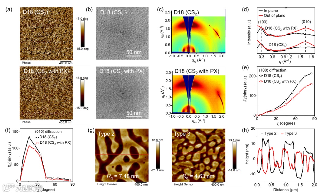 图 3. 对二甲苯(PX)添加剂对底部D18层和整体活性层微观结构的影响。a) D18薄膜的原子力显微镜(AFM)高度图像;b) D18薄膜的透射电子显微镜(TEM)图像;c) 二维掠入射X射线广角散射(2D-GIWAXS)图案, d) 面内和面外方向上的一维(1D)X射线散射图;2D-GIWAXS 图案的 e) (100)和 f) (010) 衍射信号的方位图,其中 𝜒 是方位角;g) Type 2 和Type 3活性层的 AFM 高度图;h) AFM高度图中红线所示的高度轮廓。