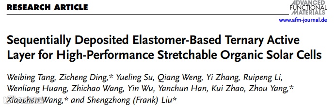 近日,陕西师范大学刘生忠教授、丁自成研究员、王晓晨研究员、杨周副教授,在国际知名期刊Advanced Function Materials上发表题为“Sequentially Deposited Elastomer-Based Ternary Active Layer for High-Performance Stretchable Organic Solar Cells”的文章。该文章报道了利用添加剂辅助的顺序沉积策略来优化活性层微结构(底层为高分子给体D18薄膜,顶层为非富勒烯受体Y6与弹性体SEBS的共混薄膜),制备的活性层COS达到26.38%,同时相应OSC器件的能量转换效率(PCE)达到16.54%,从而实现了4.36%的高效率拉伸因子(ESF),是目前可拉伸OSC的最高值之一。