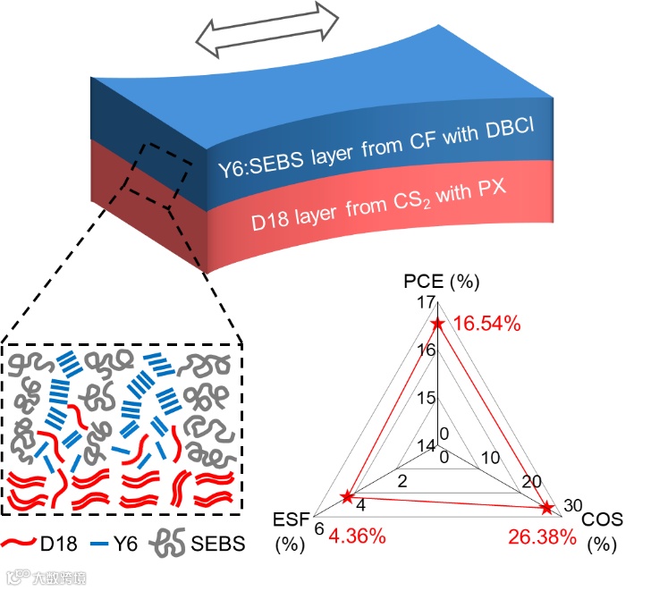 D18:Y6给受体组合被广泛用于OSC中,可实现高的效率,而弹性体SEBS具有良好的形变能力。作者选择合适的主溶剂和添加剂来加工底层D18薄膜和顶层Y6:SEBS薄膜,制备出光伏和拉伸性能不同的活性层薄膜。利用主溶剂二硫化碳(CS2)加工底层D18,利用对D18溶解度较低的氯仿(CF)溶剂加工顶层Y6,制备D18/Y6双层结构活性层(Type 1薄膜),可实现15.71%的PCE,但COS只有10.56%;在顶层Y6薄膜中引入少量SEBS,可显著改善整个活性层(Type 2薄膜)的拉伸性能,COS提升至19.80%,但相应电池效率降低至14.83%;当在二硫化碳(CS2)中加入少量对D18溶解性较差的溶剂添加剂对二甲苯(PX),活性层(Type 3薄膜)的PCE和COS可分别提升至15.86%和23.81%;进一步利用与Y6具有较强相互作用的固体添加剂1,3-二溴5-氯苯(DBCl)处理顶层Y6:SEBS薄膜,活性层(Type 4薄膜)COS可达26.38%,电池PCE可达16.54%,ESF可达4.36%。以上结果说明添加剂辅助顺序沉积策略可有效提升三元活性层的光伏和拉伸性能。