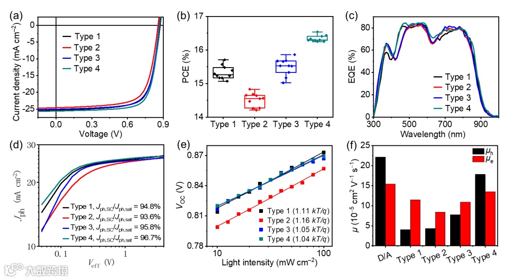 图 1. 基于不同活性层的OSC光伏性能。a) 最佳器件的电流密度-电压曲线(J-V);b) PCE统计分析;c) 最佳器件的外量子效率(EQE)曲线;d)光生电流密度-有效电压曲线(Jph−Veff);e) 开路电压(VOC)的光强依赖性;f) 不同薄膜的载流子迁移率。