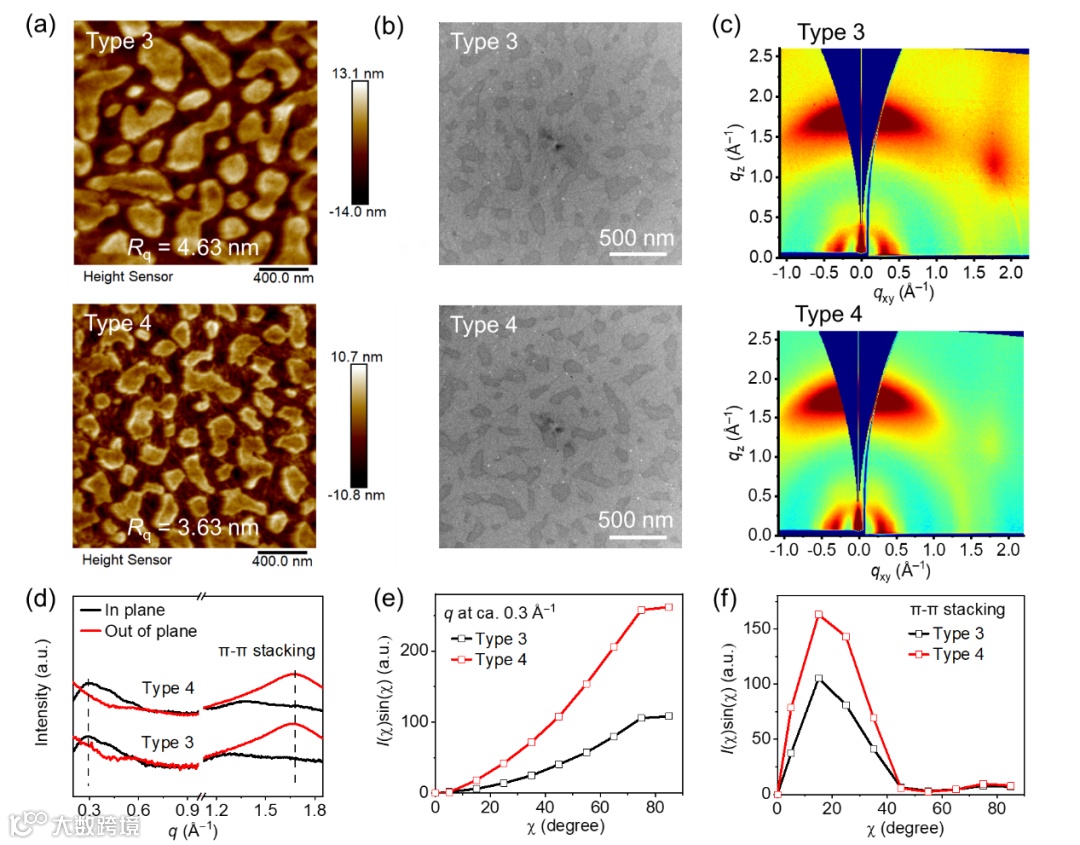 图4. Type 3和Type 4活性层的微观结构。a) AFM高度图像;b) TEM图像;c) 2D-GIWAXS图案;以及 d) 面内和面外方向上的一维(1D)X射线散射图;2D-GIWAXS 图案中e) 在处q~0.3 Å−1处和 f) 𝜋–𝜋 堆积衍射的方位图。