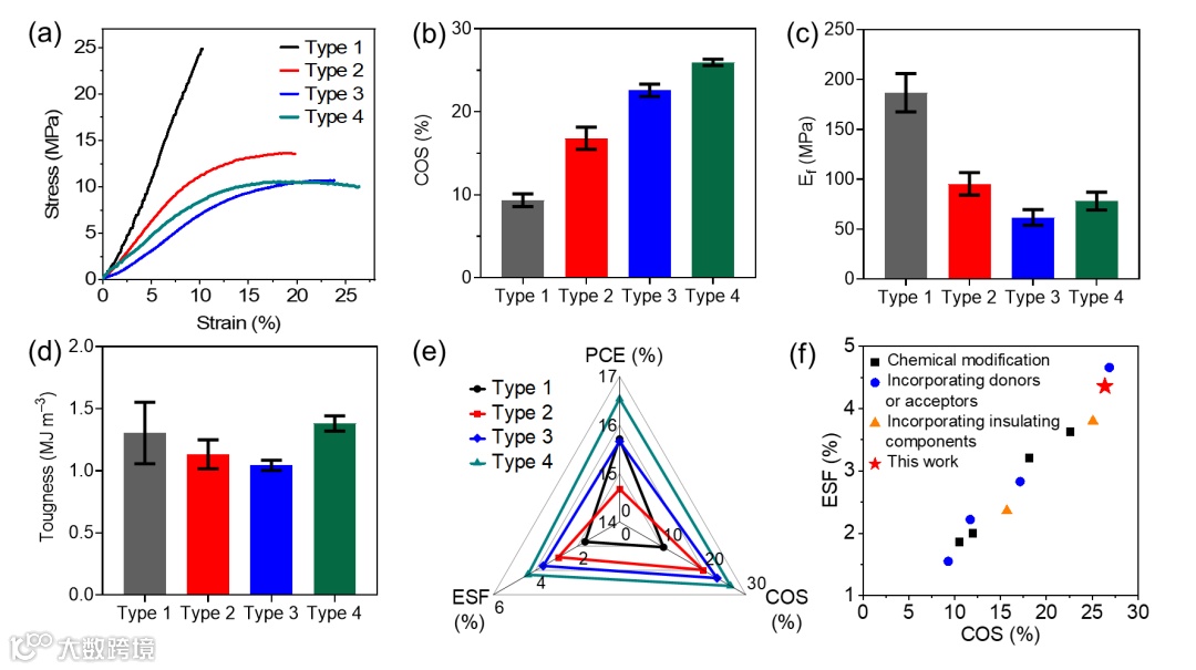 图 2. 不同活性层的力学性能。a)不同薄膜的应力-应变曲线;b) 断裂应变(COS)、c) 弹性模量(Ef)和 d) 强度(Toughness)的比较;e) 不同体系光伏共混膜的COS、PCE和ESF的三角形图例;f) 基于报道的聚合物给体和NFA体系的其他工作和本工作中PCE超过15%活性层的COS和ESF值的比较。