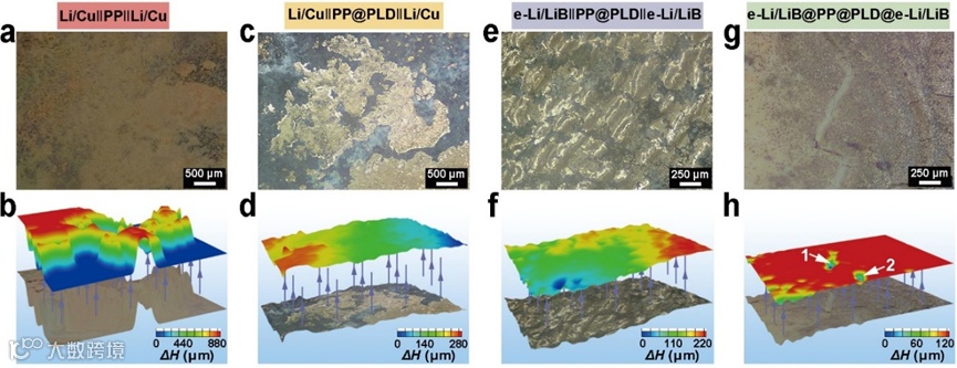 图5. (a和b)Li/Cu‖PP‖Li/Cu,(c和d)Li/Cu‖PP@PLD‖Li/Cu,(e和f)e-Li/LiB‖PP@PLD‖e-Li/LiB和(g和h)e-Li/LiB@PP@PLD@e-Li/LiB在锂-锂对称电池循环500 h后的光学显微镜图像。