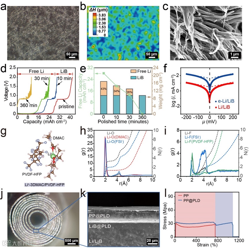 图2.(a)光学显微镜图像和(b)相应的原始Li/LiB的三维重构图。(c)Naph/THF处理后LiB骨架结构的SEM图像。(d)不同刻蚀时间的Li/LiB负极的充电电压曲线和(e)对应的Li含量。(f)原始Li/LiB负极和刻蚀30分钟的e-Li/LiB的对称电池Tafel图。(g)Li+、DMAC、PVDF-HFP系统的优化结构。在LiFSI-3DMAC/HVDF-HFP系统中,计算得到的(h) DMAC和FSI-中的O原子围绕Li+的径向分布函数g(r)和配位数N(r),以及(i)FSI-和PVDF-HFP中的F原子围绕Li+的配位数N(r)。(j)卷轴形式一体化负极的光学图像。(k)一体化负极接触界面的截面SEM图。(l)应变速率为20 mm min-1时不同薄膜的应力-应变曲线。