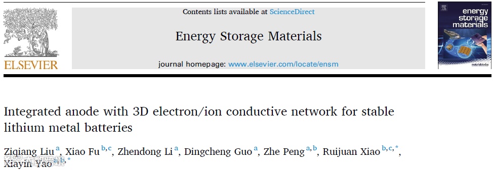 Ziqiang Liu, Xiao Fu, Zhendong Li, Dingcheng Guo, Zhe Peng, Ruijuan Xiao, Xiayin Yao, Integrated Anode with 3D Electron/Ion Conductive Network for Stable Lithium Metal Batteries, Energy Storage Materials (2024)