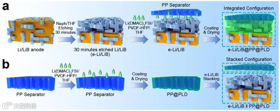 图1. (a)三维一体化锂负极e-Li/LiB@PP@PLD的制备过程示意图。(b)隔膜支撑的PVDF-HFP基电解质PP@PLD的制备过程及结构示意图。