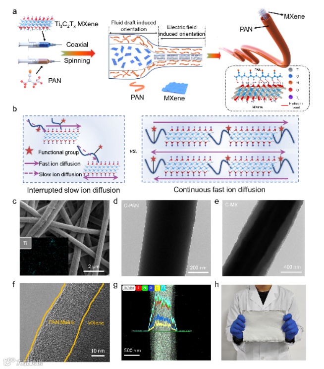 图 1a展示了通过将 MXene 纳米片同轴引入到聚丙烯腈 (PAN) 纤维中来制造 C-MX SPE 的过程。通过流体场和外加电场的两阶段取向诱导可以有效促进 MXene 纳米片限域到 PAN 纤维中。将 MXene 共轴限域在 PAN 基质中可以有序地构建连续的快速锂离子扩散通道(图 1b)。MXene纳米片表面丰富的官能团(如-F、-O、-H -OH)可以充分吸附PAN的阳离子,而这些阳离子又可以通过静电和氢键相互作用自组装到MXene纳米片的表面,从而提供比纯聚合物基体更快的锂离子扩散能力。