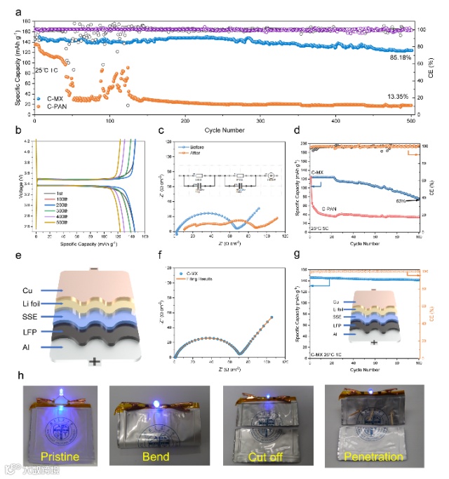 为了研究共轴限域的C-MX SPE的电化学性能,组装并测试了Li|C-MX|LFP和Li|C-MX|NCM811 全固态锂金属电池的电化学性能。可以从图4e看到Li|C-MX|LFP电池在室温下表现出良好的倍率性能,在10C下仍然能够保持101 mAh g−1的放电容量。此外,此SSLMB在0°C 到 90°C宽温域下同样能够表现出良好的循环稳定性(图4h)。在室温长循环稳定方面,基于C-MX SPE的SSLMB在1C的电流密度下,能够稳定循环超过500圈(图5a),并能够制备成大尺寸的软包柔性锂金属电池,在极端条件下仍然能够稳定工作(图5h),证实其良好的安全性能。