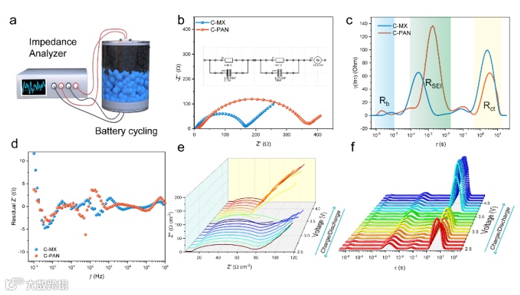 图 3. 共轴限域MXene SPE 中锂离子动力学的原位表征。a. 原位电化学阻抗表征示意图 b. 原位 EIS 测试前 C-MX 和 C-PAN 的奈奎斯特图 c. C-MX和C-PAN SPE相应的DRT结果 d. 希尔伯特变换阻抗的实部和虚部的残差样本图 e. C-MX 的原位阻抗谱图 f.根据原位阻抗数据计算得出的DRT 结果。