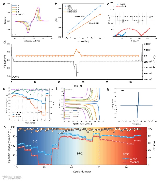 图 4 基于共轴限域 MXene SPE 的 SSLMB 的电化学性能 a. 基于 C-MX SPE 的 SSLMB 在不同扫描速率下的循环伏安曲线b. C-MX 和 C-PAN SPE 峰值电流与扫描速率的平方根关系图 c. 基于 C-MX 和 C-PAN SPE 的 SSLMB 循环前的EIS图 d. C-MX SPE 的GITT 结果和相应的锂离子扩散系数 e. 基于 C-MX 和 C-PAN SPE 的 SSLMB 在 0.1 至 10 C 下的倍率性能 f. 基于 C-MX SPE 的 SSLMB 在 0.1 至 10 C 下的充放电曲线 g. 基于C-MX SPE 的 SSLMB 的 dQ/dV 曲线 h. 基于 C-MX 和 C-PAN SPE 的 SSLMB 的宽温域电化学性能。