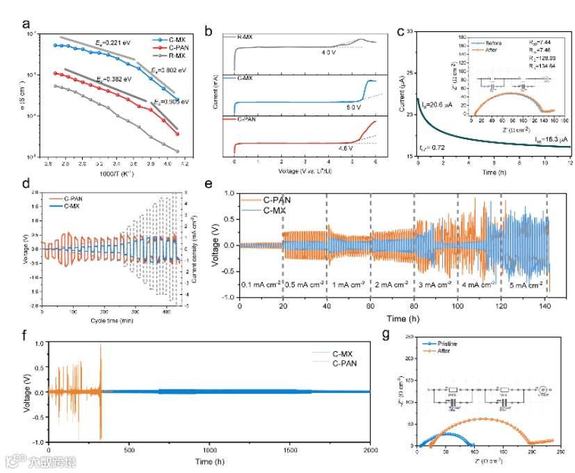 图 2 共轴限域 MXene SPE 的电化学性质 a. C-MX、C-PAN 和 R-MX SPE 的离子电导率以及相应的活化能 b. C-MX、C-PAN 和 R-MX SPE 的电化学稳定窗口c. C-MX SPE的锂离子迁移数以及极化前后的EIS曲线 d. C-MX 和 C-PAN SPE 的临界电流密度 e. C-MX 和 C-PAN的锂对称电池的倍率性能 f. C-MX和C-PAN的锂对称电池在1 mA cm−2电流密度下的长循环性能 g. C-MX的锂对称电池循环前后的EIS图。