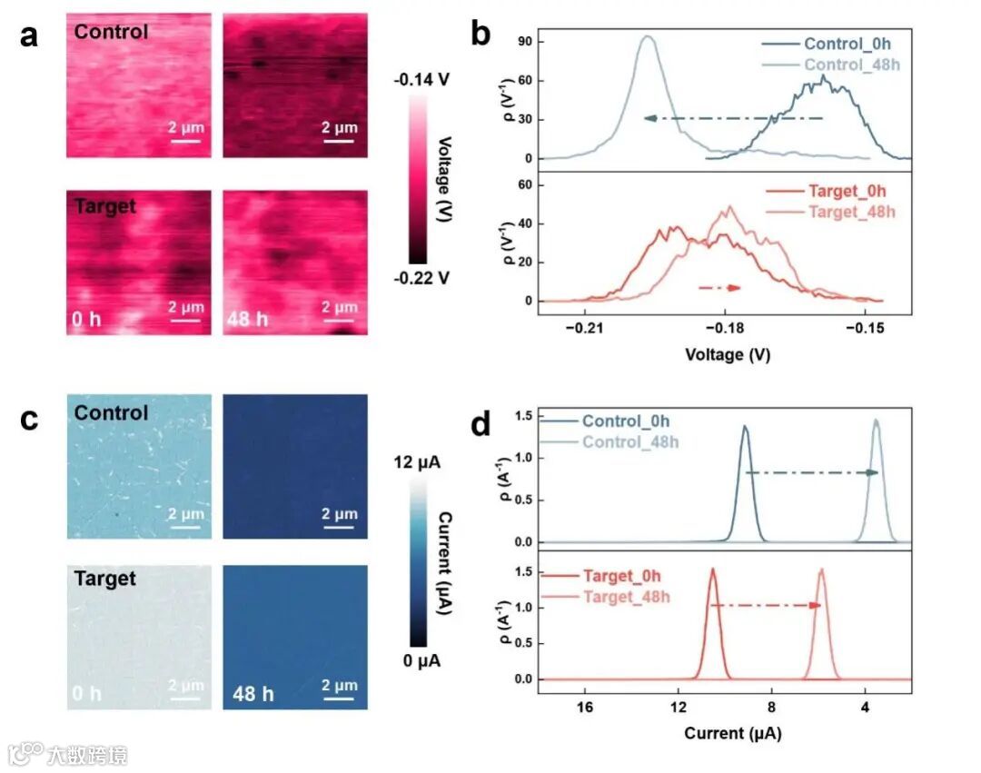 通过开尔文探针力显微镜以及导电原子力显微镜表征了加热老化过程中,锂离子对钙钛矿电学性质的影响以及MSBH对钙钛矿电学性质的保护。