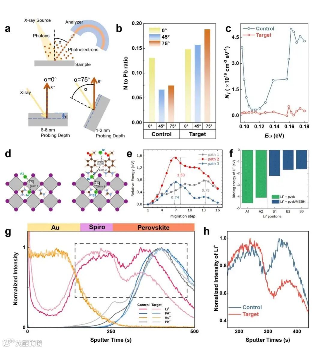 MSBH的脒基通过填充钙钛矿的A位空位缺陷,抑制钙钛矿的缺陷产生,同时占据离子迁移通道,阻碍了锂离子的迁移。密度泛函理论(DFT)计算证明了MSBH的处理大大增强了锂离子的迁移势垒,并且减弱了锂离子与铅碘八面体框架的作用。老化500小时器件的飞行时间二次离子质谱(Tof-SIMS)结果证明了MSBH对锂离子迁移的抑制。