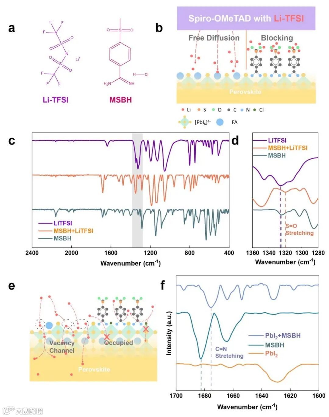 4-甲磺酰基-苯甲脒盐酸盐(MSBH)具备两个官能团,甲磺酰基以及脒基。其中,甲磺酰基与碱金属具有较强的配位性,可以抑制Spiro-OMeTAD中的锂离子向钙钛矿层迁移以及在Spiro-OMeTAD中的耗竭,保持了空穴传输层的传输能力。同时MSBH结构另一端的脒基与碘化铅有强相互作用,可以钝化钙钛矿表面的A位空位缺陷。
