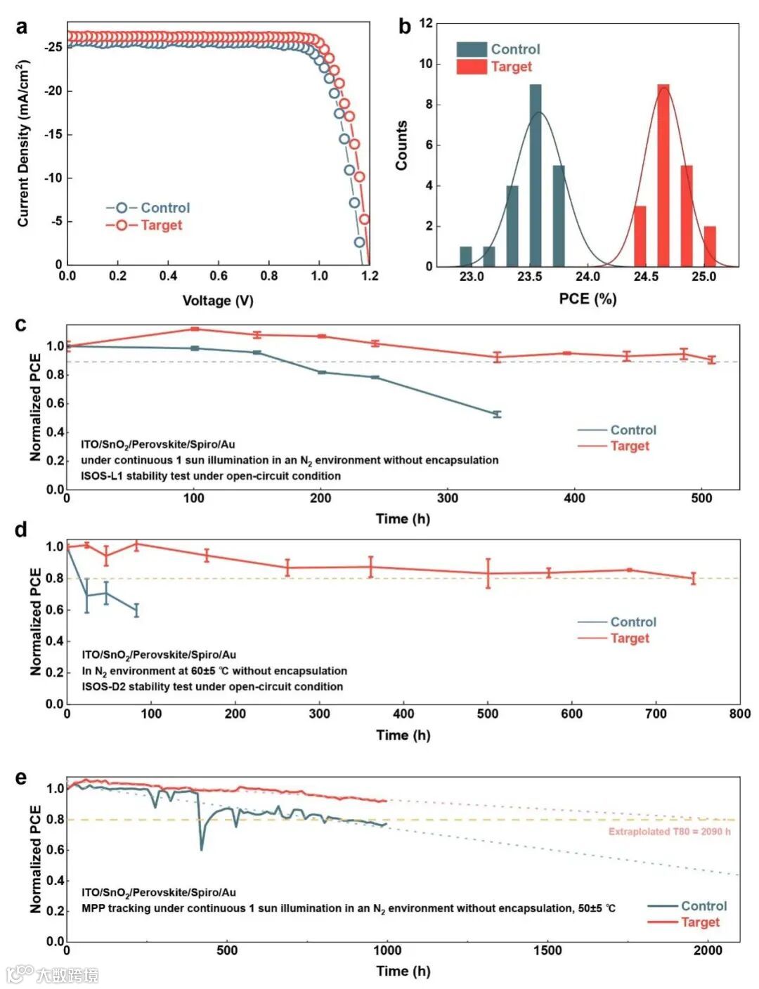 MSBH抑制剂的处理钝化了钙钛矿的缺陷、优化了钙钛矿与空穴传输层的能级排列并且提升了钙钛矿的导电性。因此,MSBH处理后的钙钛矿太阳能电池的光电转化效率得到了提升。同时,通过对锂离子迁移的抑制,我们记录了MSBH处理后的器件在连续1太阳光照下520小时的T90、在60±5℃下加热老化740小时的T80、和在50±5℃的最大功率点(MPP)跟踪下1000小时的T92。