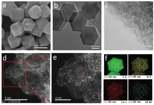 Figure 1. Morphological and structural characterizations. (a) Representative scanning electron microscopy images of HfCo–N–C; (b,c) transmission electron microscopy images of HfCo–N–C; (d and e) High-angle annular dark-field scanning transmission electron microscope image (red cycles marked diatoms, and blue cycles marked single atom) represent the catalyst containing atomically dispersed Co and Hf sites, and dual metal sites corresponding; (f) elemental mapping images showing the distribution of C (green), N (yellow), Co (red) and Hf (blue) within the catalyst