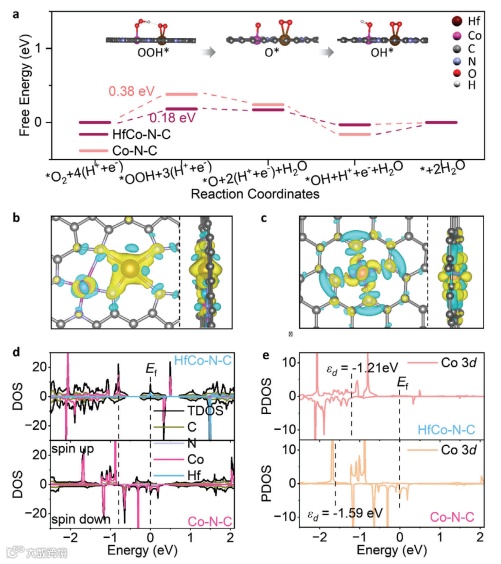 Figure 5. Dual metal synergistic effect and DFT simulation (a) ORR free energy diagrams at U = 1.23 V. (b and c) The different charge density plots of HfCo–N–C, Co–N–C, respectively; the yellow and blue area represents the electron accept and donate, respectively; (d and e) The DOS and PDOS plot of HfCo–N–C and Co–N–C, respectively