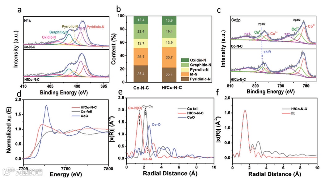 Figure 2. Structural characterization of the catalysts. (a) High-resolution -ray photoelectron spectroscopy N1s spectra of Co–N–C and HfCo–N–C; (b) Statistical column graphs of the nitrogen distribution in Co–N–C and HfCo–N–C; (c) High-resolution Co2p and deconvolution spectra of Co–N–C and HfCo–N–C; (d) Normalized Co K-edge X-ray absorption near edge structure spectrum of HfCo–N–C and reference samples; (e) FT k2-weighted of the extended X-ray absorption fine structure (EXAFS) spectra for Co K-edge; (f) The Fourier transform-EXAFS spectrum of Co K-edge at R space and its corresponding fitting curve