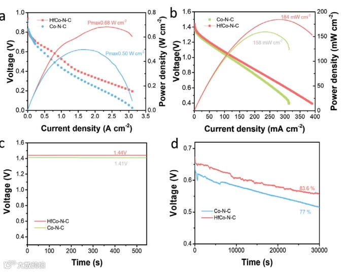 以HfCo-N-C、Co-N-C和商用Pt/C催化剂为空气/氧阴极,组装并评估了一系列膜电极组件 (MEAs) 和ZABs,来评估HfCo-N-C催化剂在清洁能源装置中使用的可行性。以HfCo-N-C为催化剂的单体电池的开路电压(OCV)高达0.94 V,H2-O2气氛下峰值功率密度 (PPD) 可达680 mW cm−2,远高于Co-N-C (OCV 0.90 V, PPD 500 mW cm−2)。在经过30,000 s 计时电压测试后,以Co-N-C 为催化剂的MEA的电压下降幅度为23 %,以HfCo-N-C为催化剂的电池的电压下降幅度仅为16.3 %,表明HfCo-N-C具有优异的稳定性,Hf的引入显著提高了催化剂的催化耐久性和稳定性。