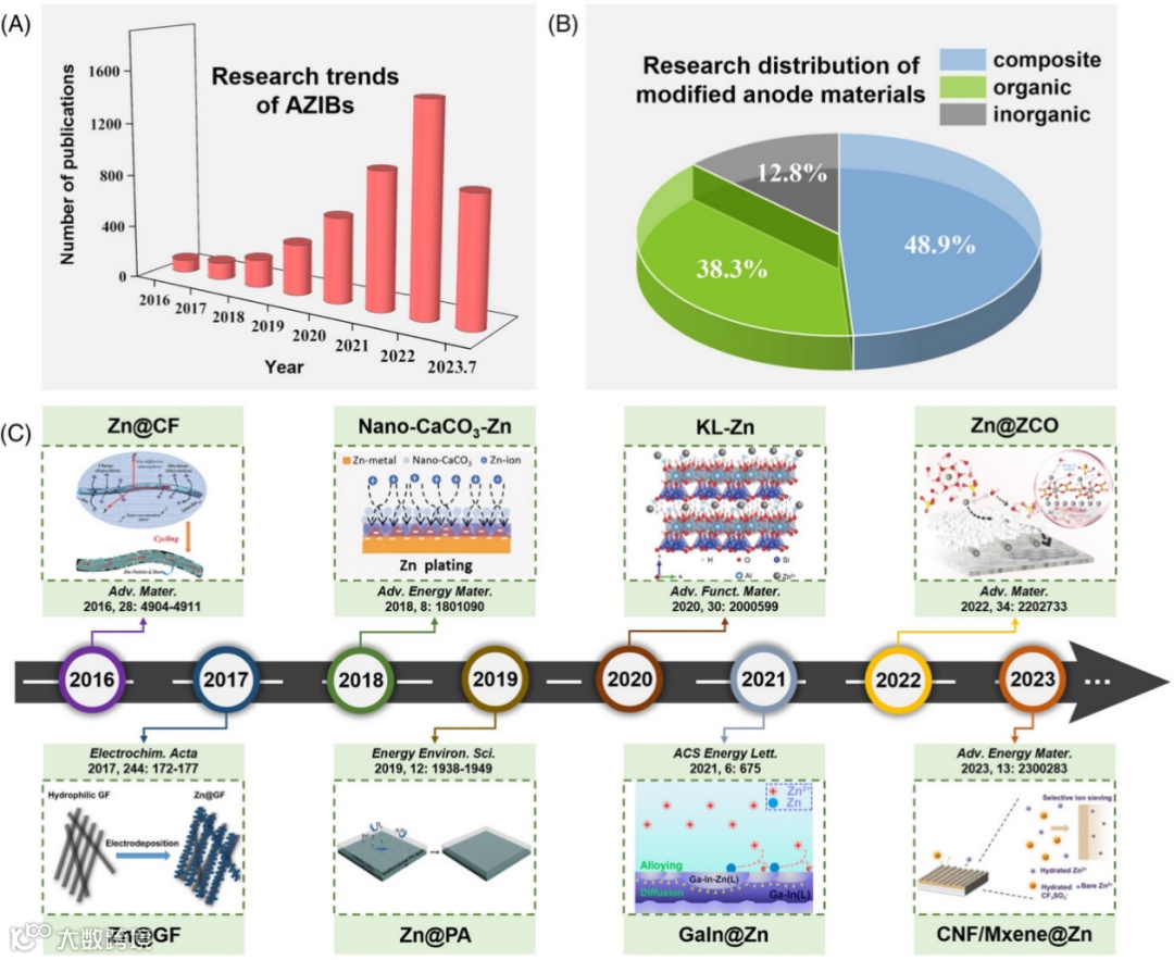 (A) AZIBs的研究趋势(截至2023年7月)。(B) AZIBs中改性负极材料的研究分布。(C) 功能化锌负极杰出作品时间轴图。