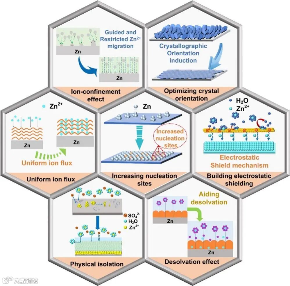功能化锌负极的保护机理包含离子约束效应、调整晶体取向、均匀离子通量、增加成核位点、构建静电屏蔽、物理隔离和去溶剂化效应。