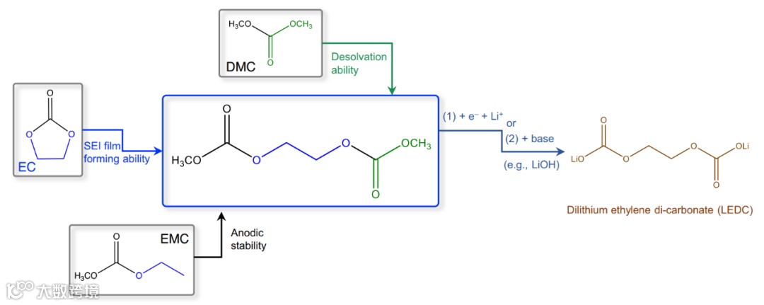图1. 选择 2,5-二氧杂己二酸二甲酯 (DMDOHD) 作为电解液溶剂的设计原理。