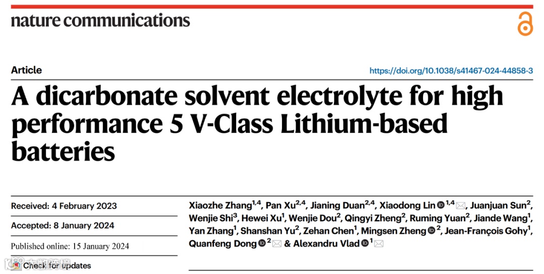 近日,来自比利时鲁汶大学的Alexandru Vlad教授团队和厦门大学董全峰教授团队合作,在国际知名期刊Nature Communications上发表题为“A dicarbonate solvent electrolyte for high performance 5 V-Class Lithium-based batteries”的研究工作。该工作报告了一种适用于5 V 级锂基电池的二碳酸酯溶剂电解液体系。得益于该二碳酸酯溶剂特殊的化学结构、与锂阳离子的弱相互作用以及由此产生的特殊溶剂化结构,所得的电解液在无添加剂或共溶剂以及1 M的低盐浓度下,不仅能够实现稳定、无枝晶的锂沉积/溶出,而且还表现出高达5.2 V(vs. Li/Li+)的氧化稳定性。因此,在以1 M六氟磷酸锂/2,5-二氧杂己二酸二甲酯(LiPF6/DMDOHD)为基础的电解液体系中测试Li||LiNi0.5Mn1.5O4电池可以获得优异的电化学性能,在循环250次后仍能保持初始容量的97%以上,优于传统的碳酸酯基电解液体系。该工作表明,二碳酸酯溶剂在锂基电池实用探索方面具有广阔的前景,对未来开发新型高效且实用的锂基电池电解液体系具有重要意义。