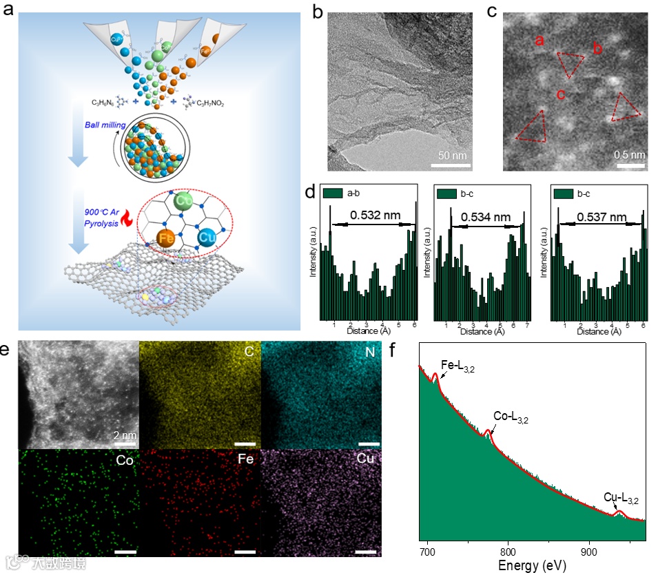 CoFeCu-TAC的合成路径如图1a所示;CoFeCu-TAC为石墨烯褶皱结构(图 1b-c);HAADF-STEM图像表明各元素均匀的分布在石墨烯基底上(图 1e);EELS进一步验证了图1e中的亮点为Co、Fe、Cu原子(图 1f)。