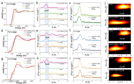 X射线吸收近边结构(XANES)和扩展X射线吸收精细结构(EXAFS)进一步研究了TM原子的局域结构和价态。CoFeCu-TAC和Co-SAC中Co的吸附边位于CoPc和Co箔之间(图2a),表明CoFeCu-TAC和Co-SAC中Co的氧化态在0和+2之间。傅里叶变换 k2 加权 EXAFS (FT-EXAFS) 光谱显示了 CoFeCu-TAC 和 Co-SAC 主要以Co-N键的形式存在(图 2b)。EXAFS拟合分析表明,CoFeCu-TAC和Co-SAC中的Co原子与四个相邻的N原子成键(图 2c)。