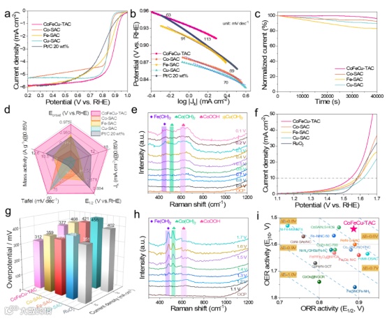 CoFeCu-TAC相较于SAC具有更好的ORR和OER性能表现。ORR方面CoFeCu-TAC的E1/2为0.891V、较小的tafel斜率更好的长期稳定性(图 3a-d)。原位拉曼显示Co是参与催化反应主要的位点(图 3e、h)。CoFeCu-TAC的OER和ORR电位差仅有0.639V图(3i)。