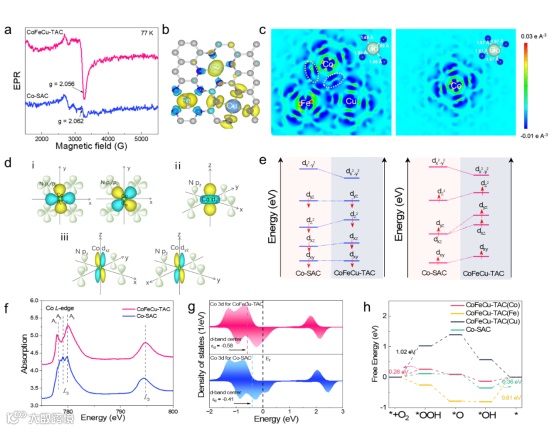 通过电子顺磁共振 (EPR) 谱进行验证CoFeCu-TAC的磁矩大于Co-SAC(图 4a)。CoFeCu-TAC 中的四个 Co-N 电荷分布和键长,与 Co-SAC 中的相比,CoN4明显对称性破坏。Co的dx2-y2和dxy轨道表现出明显的轨道分裂,费米能级以下和之上的电子态可分别归属于成键态和反键态,这个特征应该源自强的面内Co-N相互作用(图 4d)。图4e表示出了CoFeCu-TAC和Co-SAC中Co 3d轨道。另外,与Co-SAC 相比,CoFeCu-TAC中所有 Co d轨道的能级均发生显着变化。这种区别可以通过 Co L2,3 边 XAS 光谱进一步验证。CoFeCu-TAC 和 Co-SAC 的 Co L3 边缘的能量区域表现出截然不同的特征。CoFeCu-TAC (-0.58 eV) 中 Co d态的 d带中心也比 Co-SAC (-0.41 eV)低得多(图 4g),导致与氧中间体的键合强度较弱。
