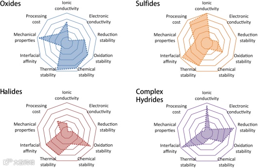 依据离子电导率、电子电导率、氧化/还原稳定性、化学稳定性、热力学稳定性、界面兼容性、机械性能及加工成本9项基本性能参数,对氧化物、硫化物、卤化物和复合氢化物固体电解质进行对比评价,如图1所示。