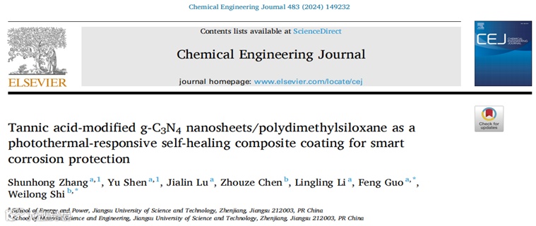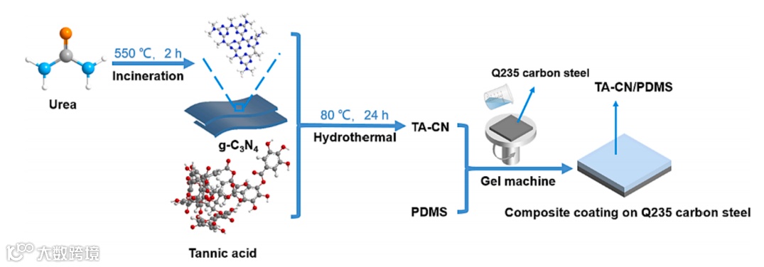 近日,来自江苏科技大学材料学院施伟龙和能源与动力学院郭峰副教授,在国际知名期刊Chemical Engineering Journal上发表题为“Tannic acid-modified g-C3N4 nanosheets/polydimethylsiloxane as a photothermal-responsive self-healing composite coating for smart corrosion protection”的研究论文。该论文采用一步低温水热法(图1)成功制备了TA-CN复合材料,采用旋涂法制备了TA-CN/PDMS复合涂层。通过电化学实验证明,TA-CN/PDMS复合涂层的抗腐蚀性能相对于空白PDMS涂层及CN/PDMS涂层有着显著提高。此外,通过划伤-愈合实验验证了涂层的光热自修复性能。利用UV-vis,PL,光电流研究了TA-CN的光吸收和光电化学。最后,探讨了TA-CN/PDMS复合涂层抗腐蚀和光热自修复的机理。