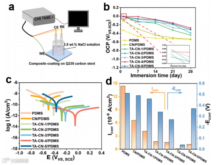 通过UV-vis、PL、VB-XPS、光电流研究了TA-CN的光吸收能力。TA改性的CN材料增强了光吸收和光生电荷分离的能力,即光生电荷的大量流入可以巧妙地流向碳钢的阴极区域,从而大大提高其典型的耐腐蚀能力。