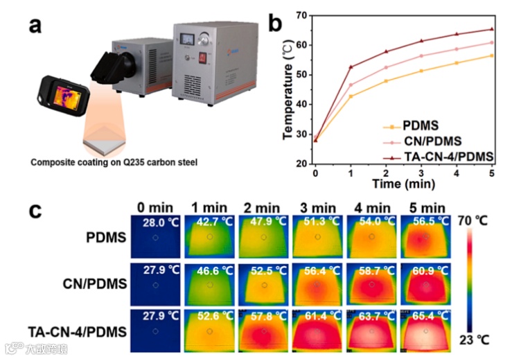 图6 (a)光热效应实验示意图。(b)AM1.5G照射下PDMS、CN/PDMS和TA-CN-4/PDMS涂层的温度变化曲线和(c)红外热像照片