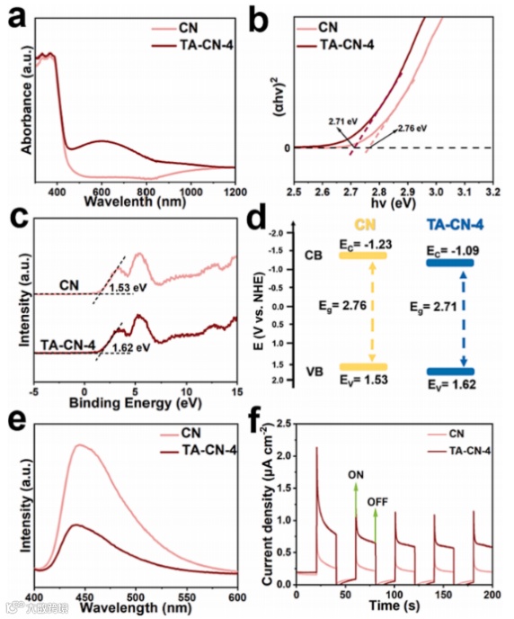 图8 (a)紫外-可见漫反射光谱;(b)估计的带隙值;(c) VB-XPS光谱和(d)能级;(e) PL光谱和(f)制备的CN和TA-CN-4样品的瞬态光电流响应。