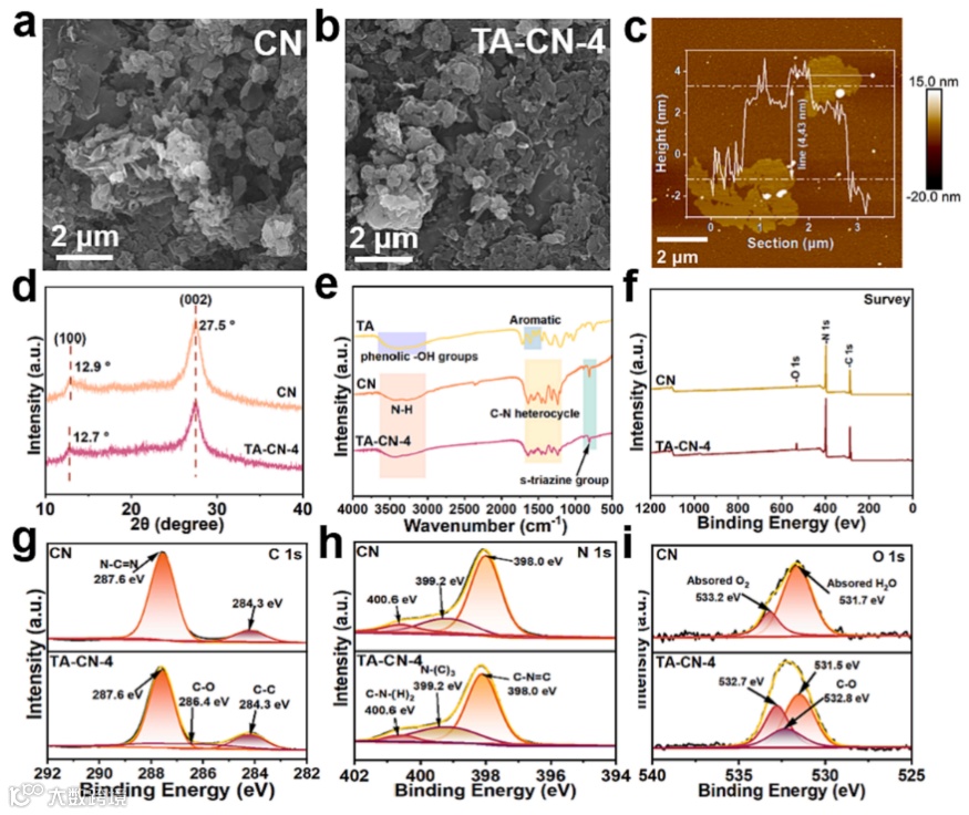 图2 (a) CN和(b) TA-CN-4的SEM图像;TA-CN-4的(c) AFM图像;CN和TA-CN-4的(d) XRD厚度;(e)TA、CN和TA-CN-4的FT-IR光谱;(f)(g)C1、(h) N 1、(i)CN和TA-CN-4上的XPS测量和高分辨率XPS光谱。