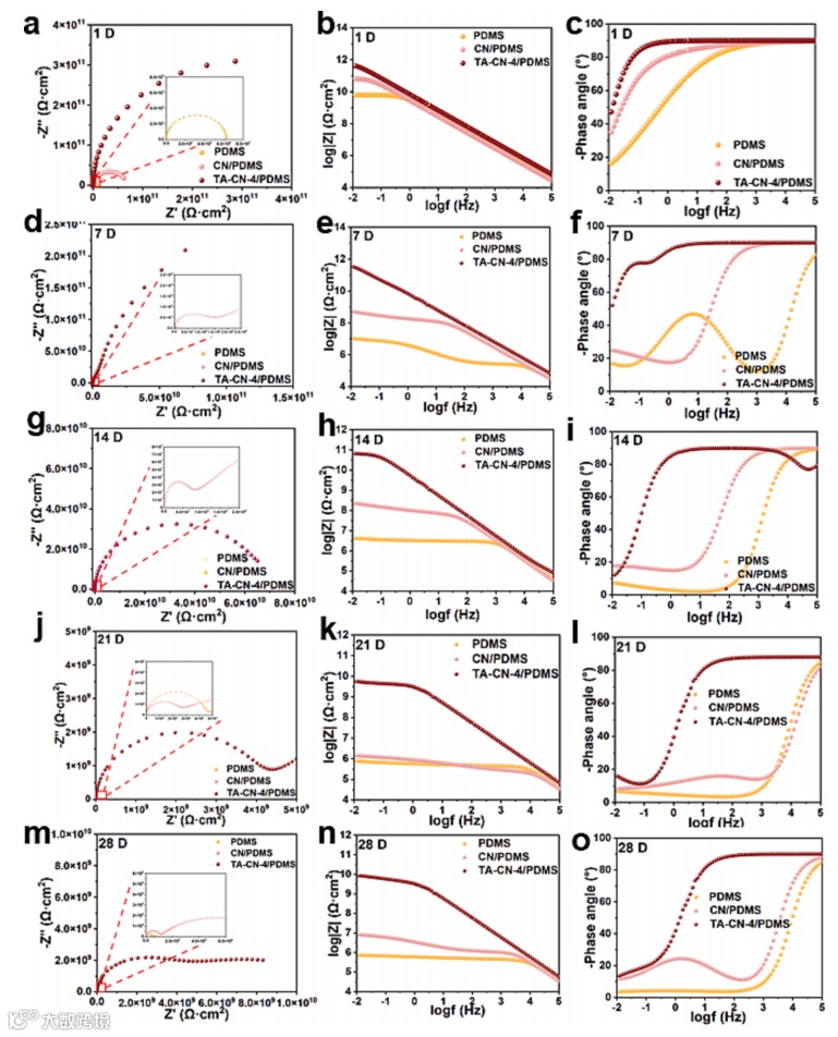 图4 在3.5 wt%氯化钠溶液中,PDMS、CN/PDMS和TA-CN-4/PDMS涂层的Nyquist图(a、d、g、j、m)、Bode图(b、e、e、h、k、n)和相角(c、f、i、l、o)图。