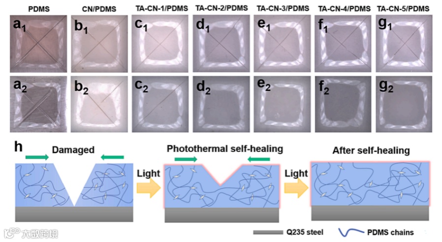 图7 PDMS(a1、a2)、CN/PDMS(b1、b2)、TA-CN-1/PDMS(c1、c2)、TA-CN-2/PDMS(d1、d2)、TA-CN-3/PDMS(e1、e2)、TA-CN-4/PDMS(f1、f2)和TA-CN-5/PDMS(g1、g2)复合涂层3小时前后划伤和愈合的扫描电镜图像。(h)TA-CN/PDMS涂层的自愈合机理示意图。