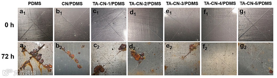 涂层的光热转换能力通过红外热成像进行验证。其次通过涂层的划伤愈合实验验证涂层的光热自修复性能,结果表明,在300W的氙灯下,涂层在3小时后,表面的划痕发生了修复。在光热的影响下,涂层达到阈值熔化温度,导致TA-CN之间的氢键重组断裂重组,从而调用了PDMS链内在的动态运动。同时,靠近受损区域的大量大分子PDMS成分巧妙地渗透到间隙中,实现了涂层的愈合。