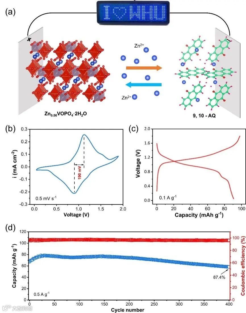 图2. Zn0.56VOPO4·2H2O || 9,10-AQ“摇椅式”水系锌离子电池的示意图和电化学性能。