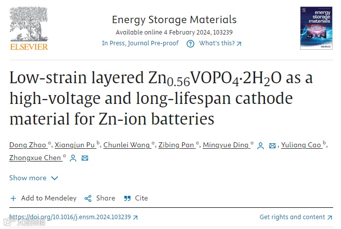 近日,来自武汉大学的陈重学副教授,在国际知名期刊Energy Storage Materials上发表题为“Low-strain layered Zn0.56VOPO4·2H2O as a high-voltage and long-lifespan cathode material for Zn-ion batteries”的研究文章。该文章开发了一种新型层状Zn0.56VOPO4·2H2O作为锌离子电池正极材料,具有低应变、高电压、长寿命等优势,并与9,10-AQ和TiS2匹配构建了摇椅式”全电池,为水系锌离子电池的研究提供借鉴。