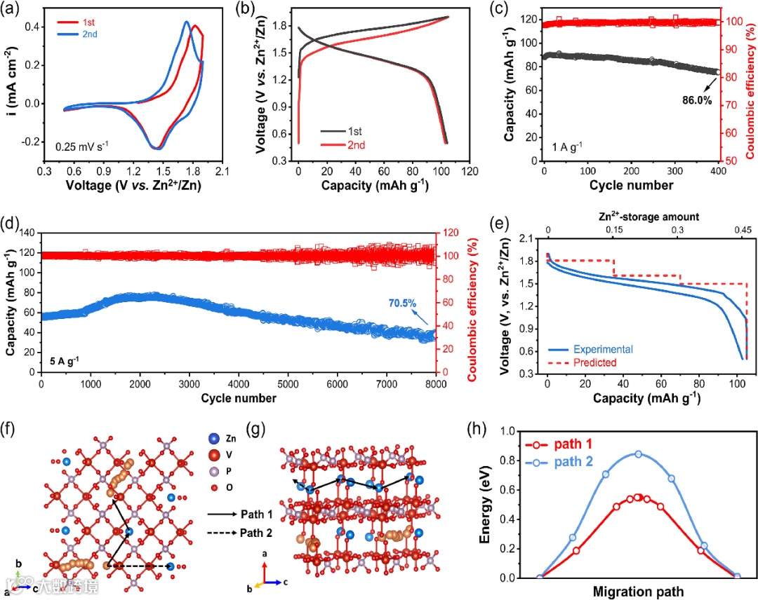 图1. Zn0.56VOPO4·2H2O正极的电化学性能,以及储锌电压和锌离子迁移路径的理论计算。