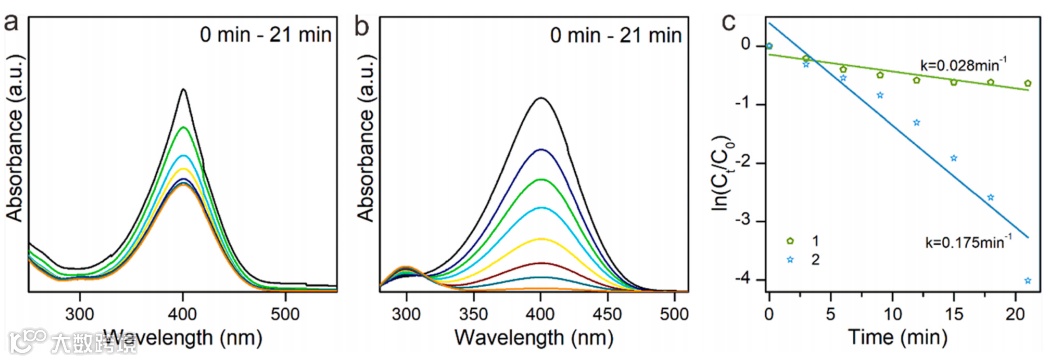 暴露在金属纳米催化剂表面的金属位点是驱动化学反应的关键。两个结构相似的Cu41簇具有不同的表面结构,它们是研究开放金属位点与催化性能关系的模型体系。作者以对硝基苯酚(p-NP)催化还原为模型反应,探究了两个团簇的催化活性。如图3所示, 1H在催化反应中不具有活性。相比之下,2H表现出更高的活性,p-NP特征峰强度衰减非常快,在21 min内消失。1H和2H的表观速率常数(k)分别计算为0.028 and 0.175 min-1。ln(Ct/C0)随时间的线性关系表明反应服从一级动力学,符合Langmuir-Hinshelwood模型的反应机制。这表明p-NP首先在团簇表面被吸附,然后被转化。2H具有更多暴露的金属活性位点,更有利于底物的吸附。这项研究清楚地证明了暴露的金属活性位点对金属纳米颗粒催化剂催化活性的重要影响。