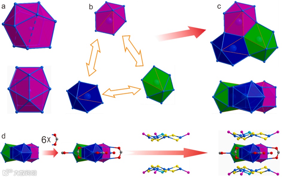 由于两个团簇具有相似的几何结构,该文仅仅解剖的是1H的结构。1H的整体结构如图1所示,为三角形结构。1H由Cu29核心和表面有机配体组成。Cu29核心由三个高度扭曲的Cu13二十面体组,Cu13包含14个三角形和3个四边形(图2)。Cu13通过共享矩形以循环方式组装,让人想起之前在Au-Ag纳米团簇中观察到的“cluster of clusters”。值得注意的是,这种Cu13基元组装的生长模式首次在Cu纳米团簇中被观察到,这表明铜团簇中普遍存在的组装复杂性。
